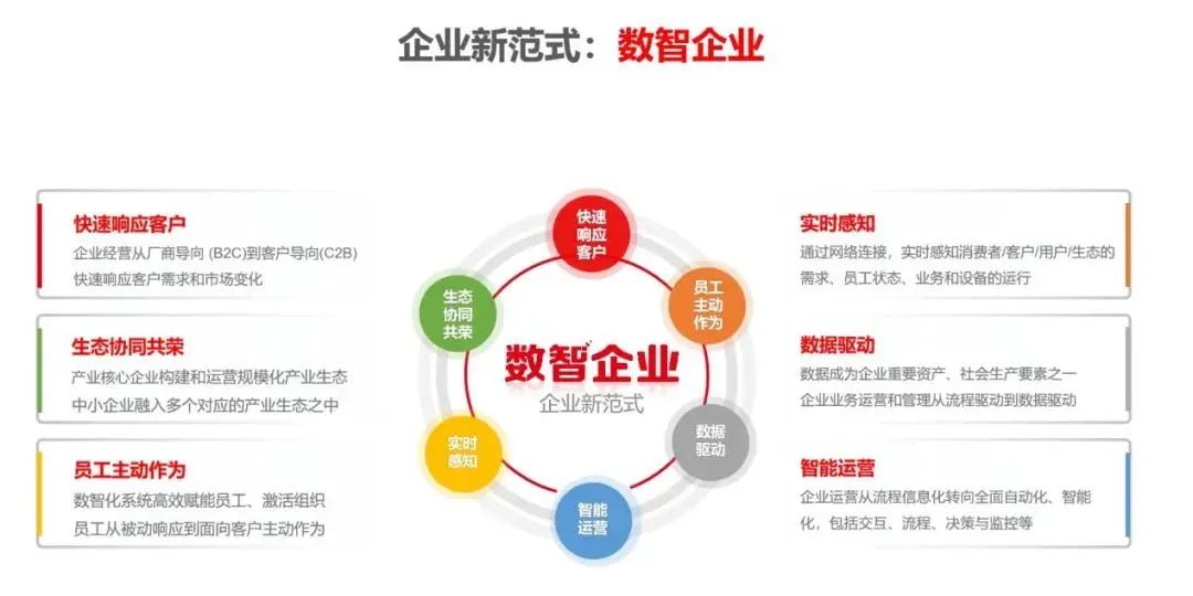 基于对全球企业发展的敏锐洞察,用友在数年前还前瞻性地提出了未来企业发展的新范式 —— 数智企业,并总结出数智企业的6大特性,即“快速响应客户、生态协同共荣、员工主动作为、实时感知、数据驱动和智能运营”,这些特性构成数智企业的画像,企业可以对照这些特性全面推进数智化转型。