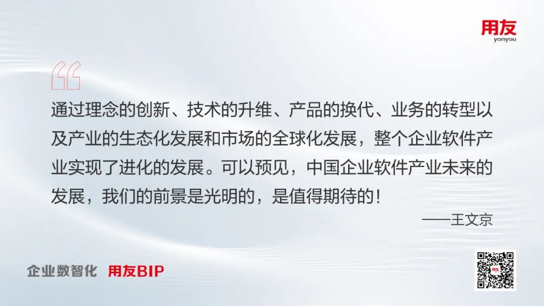 “用创想与技术推动商业和社会进步”是用友的企业使命。新时期,用友将承载起引领中国软件产业蓬勃发展的重任,通过普及用友BIP,服务中国和全球企业的数智化,引领企业走向数据驱动、智能运营的新阶段,让数智化在更多的企业成功,为发挥数字经济优势、实现高质量发展提供全面助力!