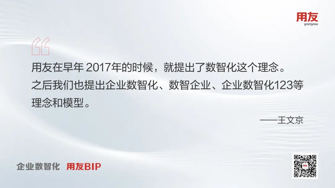 2017年,用友在业界提出“数字化+智能化”的数智化理念,表达的就是以数字化为基础,数据服务和智能服务产生新价值的内涵。多年来用友一直倡导和推进“数智化”(数字化+智能化)概念,以及“数智化”是继“信息化”之后企业、商业和社会进步发展又一个巨大历史进程的洞察论断。