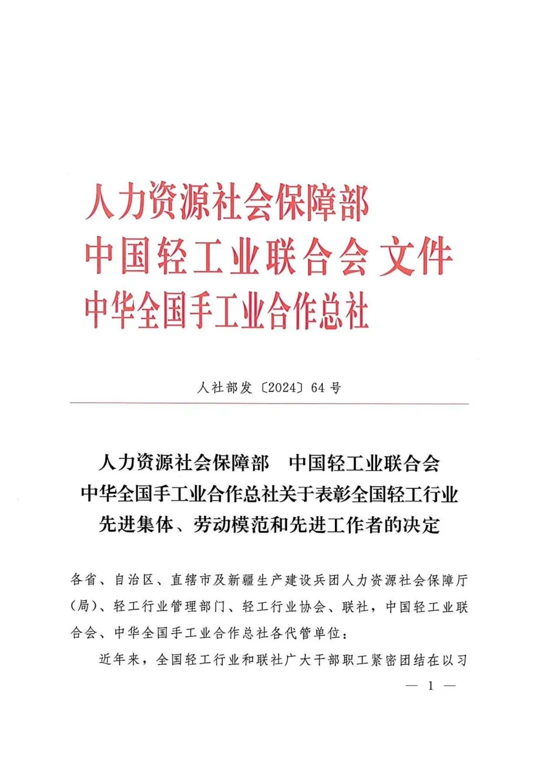 近日,人社部、中国轻工业联合会、中华全国手工业合作总社联合印发《关于表彰全国轻工行业先进集体、劳动模范和先进工作者的决定》(人社部发〔2024〕64号)文件,我公司荣获“全国轻工行业先进集体”和“全国轻工行业劳动模范”称号。