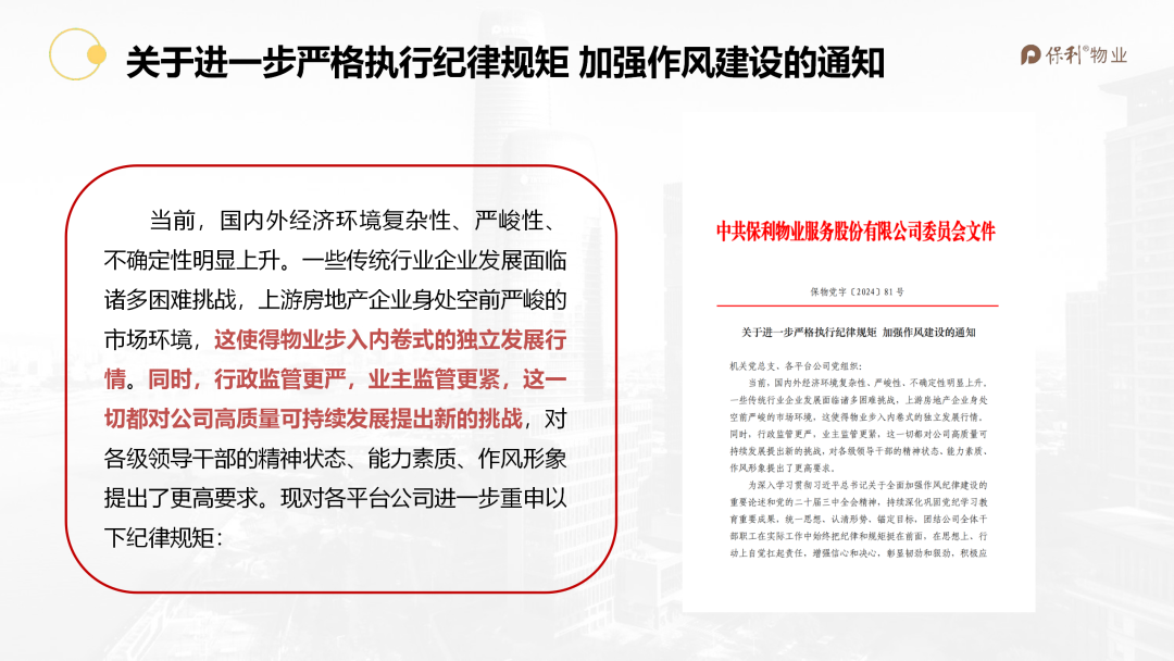会议首先分析当前国内外经济环境复杂性、严峻性及不确定性,使得物业步入内卷式的独立发展行情,对公司高质量可持续发展提出新的挑战,故对各级领导干部的精神状态、能力素质、作风形象提出了更高要求。