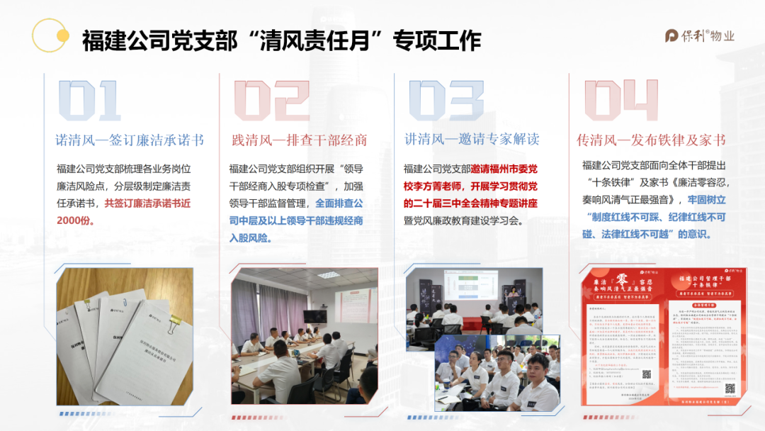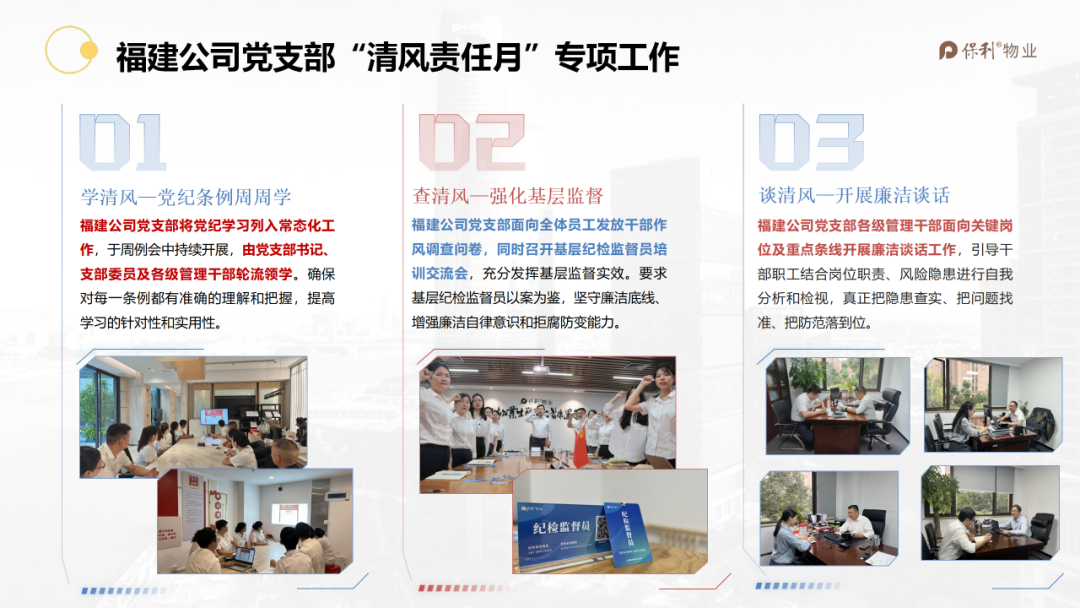 10月下旬,福建公司党支部将持续开展监督检查工作,由领导班子带队,联动职能业务条线、片区业务骨干力量及基层纪检监督员同步参与检查,针对项目收费、装修外委、安防管理等易发廉洁风险领域开展抽查监督。