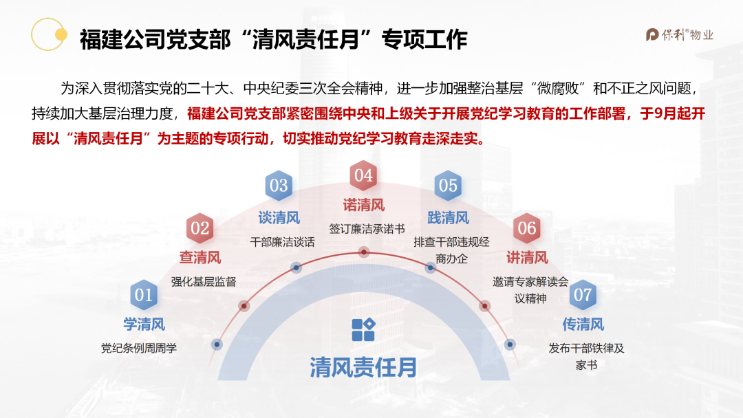 为深入贯彻落实党的二十大、中央纪委三次全会精神,进一步加强整治基层“微腐败”和不正之风问题,持续加大基层治理力度,福建公司党支部紧密围绕中央和上级关于开展党纪学习教育的工作部署,于9月起开展以“清风责任月”为主题的专项行动,切实推动党纪学习教育走深走实。
