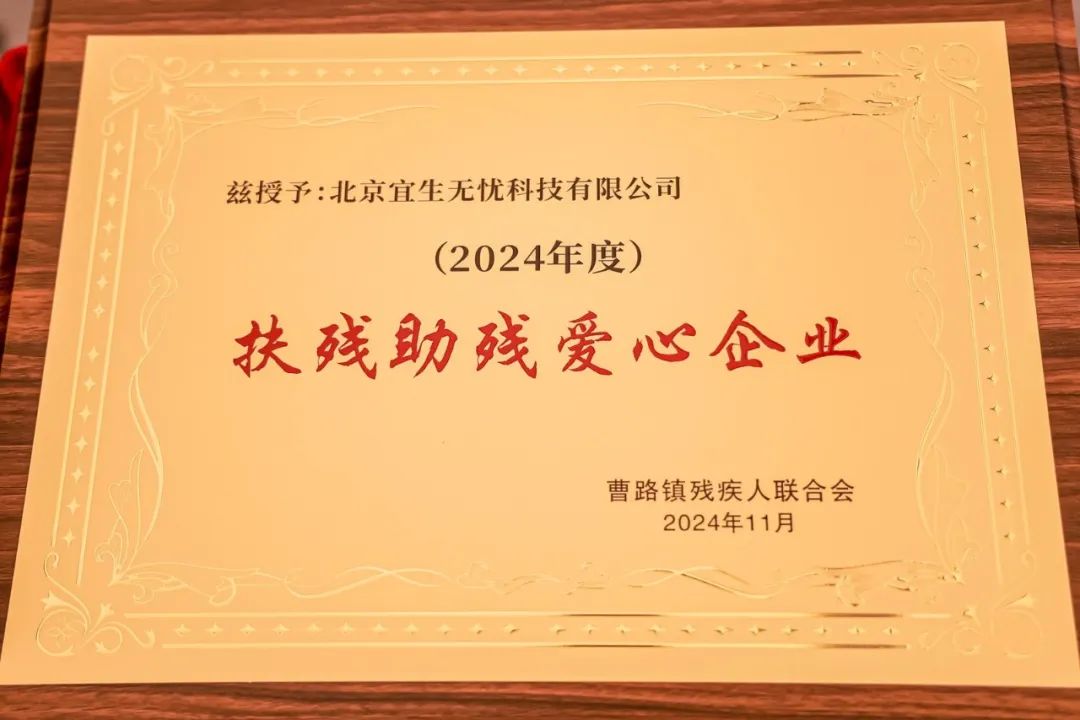 在揭牌仪式上,北京宜生无忧科技有限公司被授予了“扶残助残爱心企业”奖牌。多年来,宜生无忧始终秉持关爱社会、回馈社会的理念,积极参与各项公益事业,特别是针对残疾人事业的关注与支持,更是得到了社会各界的广泛认可。此次荣获“扶残助残爱心企业”称号,不仅是对宜生无忧长期努力的肯定与表彰,更是对其未来持续践行社会责任的鞭策与期待。