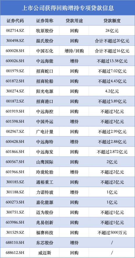 据不完全统计,参与回购增持再贷款的上市公司主要有中国石化、招商蛇口、招商轮船、招商港口、中远海控、中远海发、兆易创新、阳光电源、中国外运、牧原股份、中远海能、中远海特等众多上市公司。