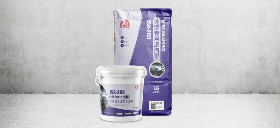 JSA-203 外墙专用透汽型聚合物水泥防水涂料是一款专用于外墙防水的双组分聚合物水泥防水涂料。产品具有良好的透汽性,能够抵抗0.3MPa的水压,真正做到防水透汽;施工方式多样,可辊涂、刷涂,施工效率高;系统兼容性好,与外墙抹面系统及腻子粘结强度高、匹配度高;柔韧性好,断裂伸长率高,能够良好地适应基层形变,柔韧抗开裂。