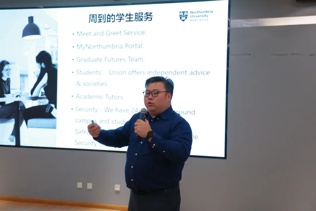 会后,诺森比亚大学伙伴关系经理王承新,与罗伯特·卡蒂共同开展讲座,从学院、专业、入学要求、花费、宿舍等方面对于诺森比亚大学进行了全面介绍。并与金融学院、创意艺术学院、国际商学院以及信息学院到场学生友好互动。