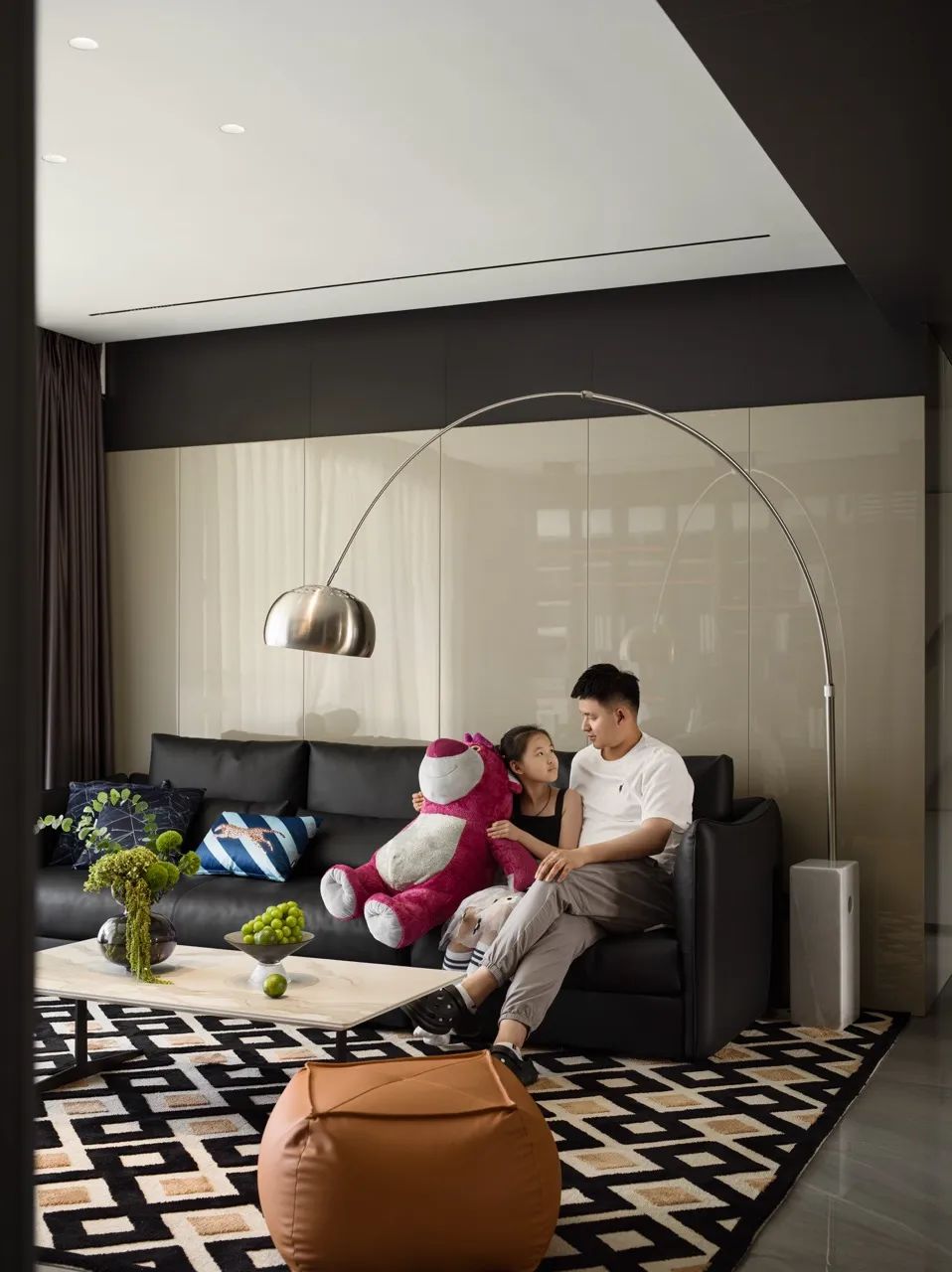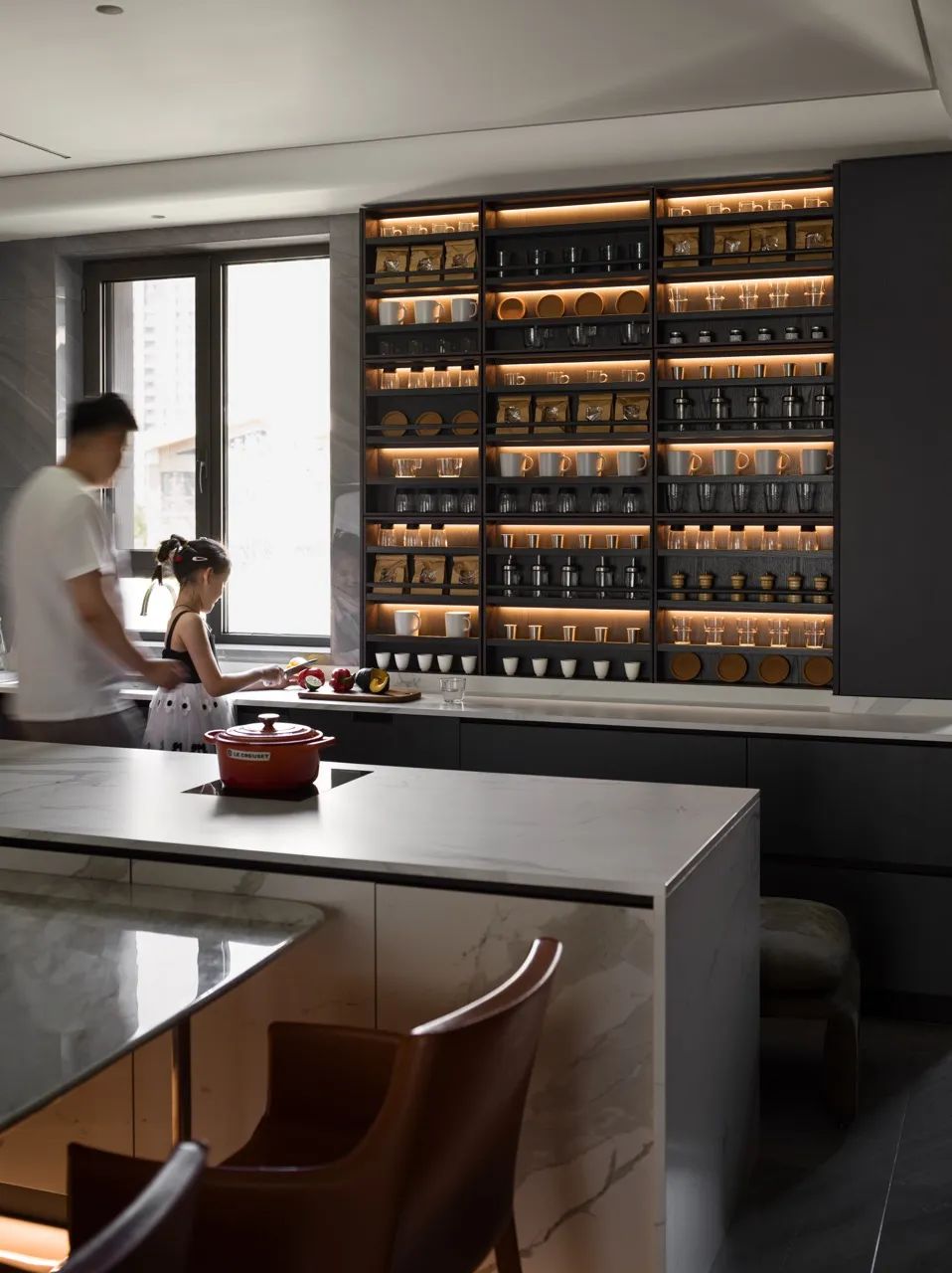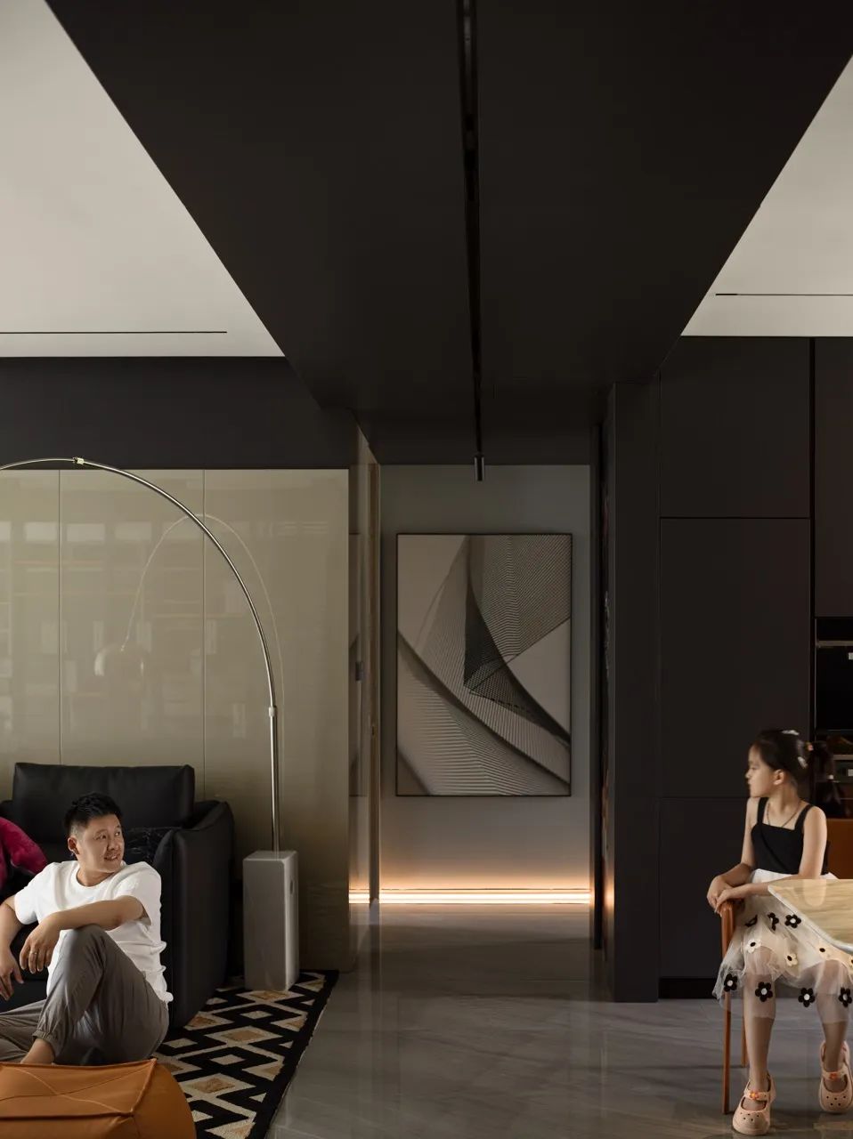 大龙一家人可以在这里吃饭、制作下午茶,还可以在岛台附近和孩子一起玩乐。打开穿插于整个空间的线性灯源,这里便成为了欢快而惬意的家庭娱乐场所。