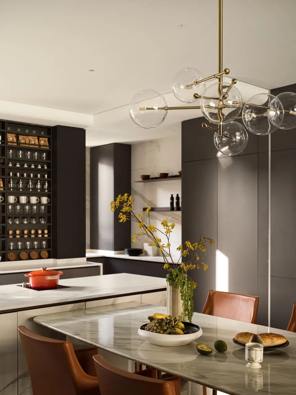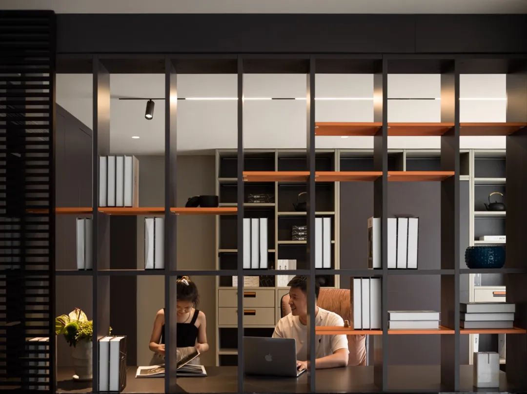 这是一个作品,也是Boloni时尚轻奢风格的范本。从明暗有序的厨柜到带有“攀升阶梯”的书架,都能感受到构筑者的巧思。