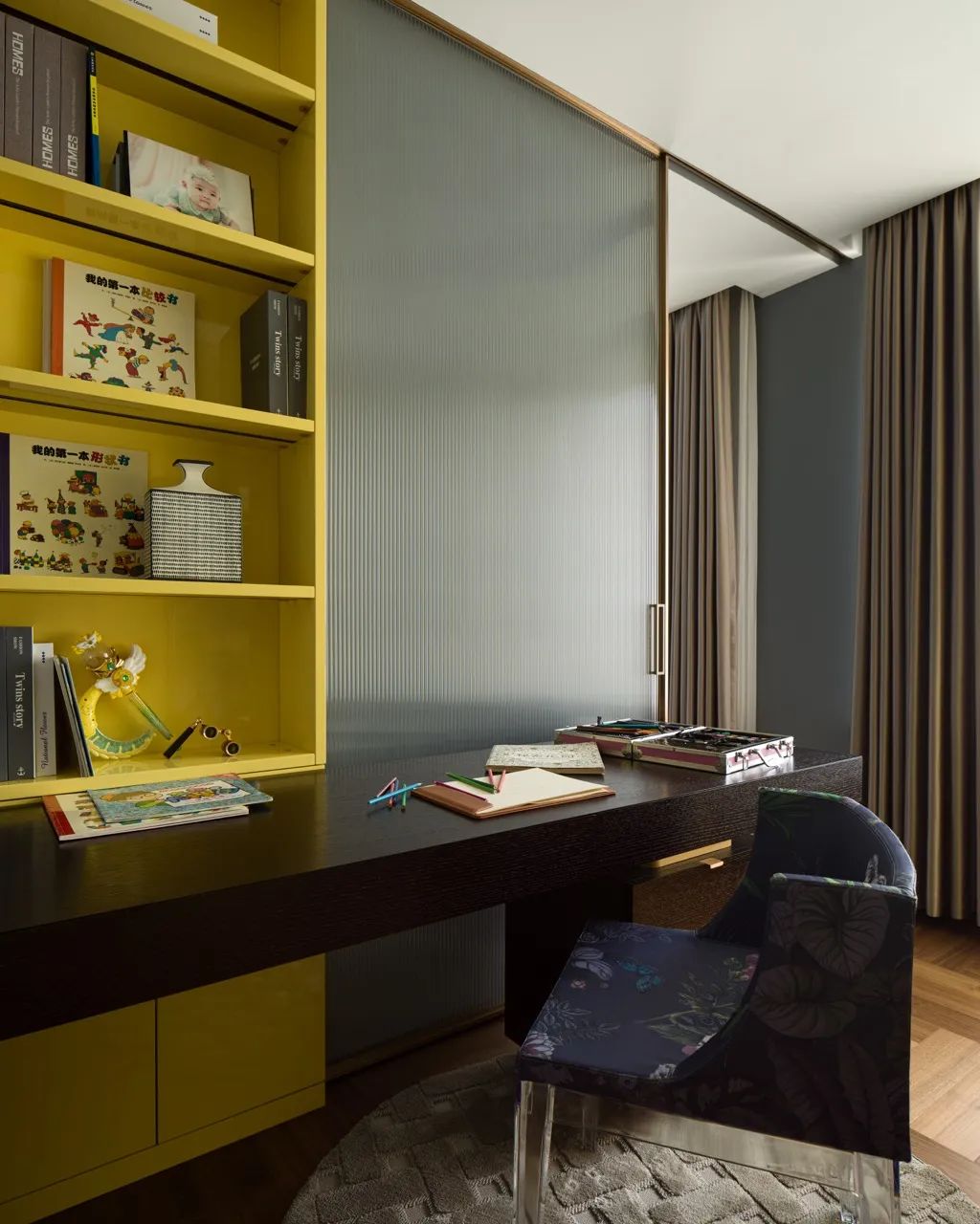卧室与书房相连,用移门进行分隔,书房还兼顾了衣帽间的功能,一面书柜,一面衣柜,均采用了亮丽的金黄色。