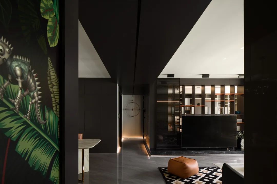 整个宅间以深空色为主颜色,辅以奶油灰作为过渡色,从客厅经由走廊延展到卧室。