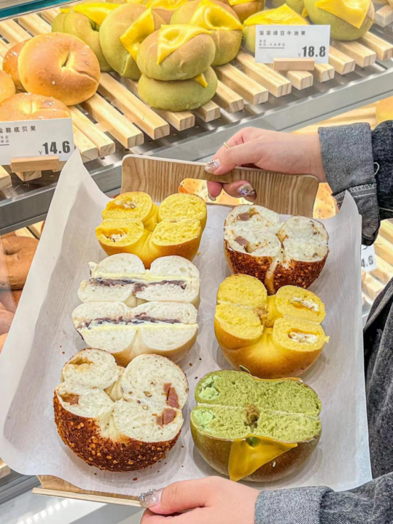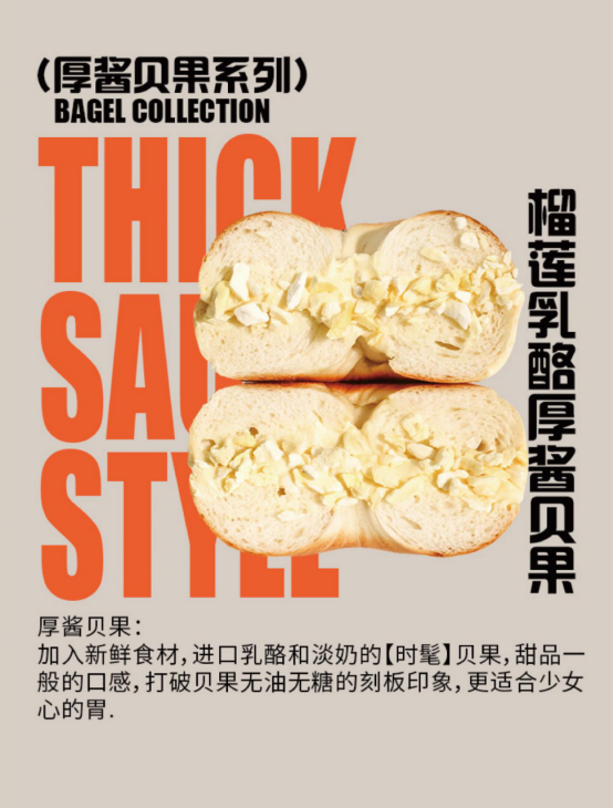 厚酱贝果:加入新鲜食材,进口乳酪和淡奶油的[时髦]贝果,甜品一般的口感,打破贝果无油无糖的刻板印象,更适合少女心的胃。