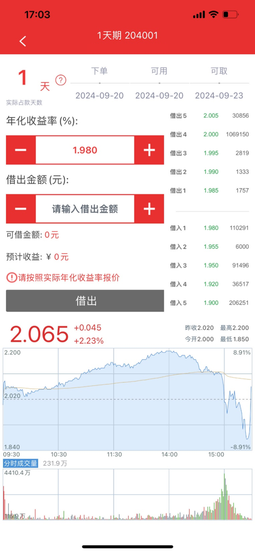 ▶ 第三步:下单页面,您只需要根据右侧实时行情数据输入合适利率和借出金额,点击下方的“借出”按钮即可完成委托(委托不代表成交)。系统会自动显示计息天数、预计收益、可用可取时间,供您决策参考。