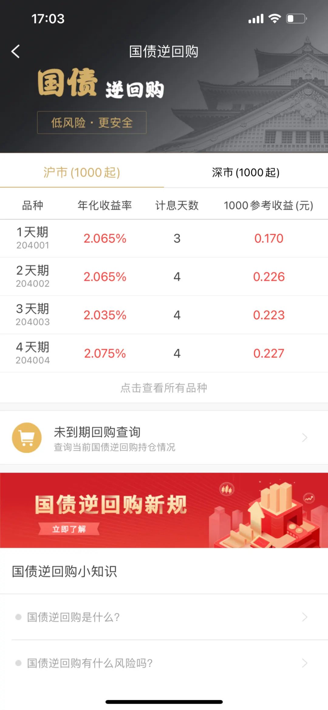 ▶ 第二步:在国债逆回购首页列表中点击想要购买的品种,完成后即可进入下单页面。