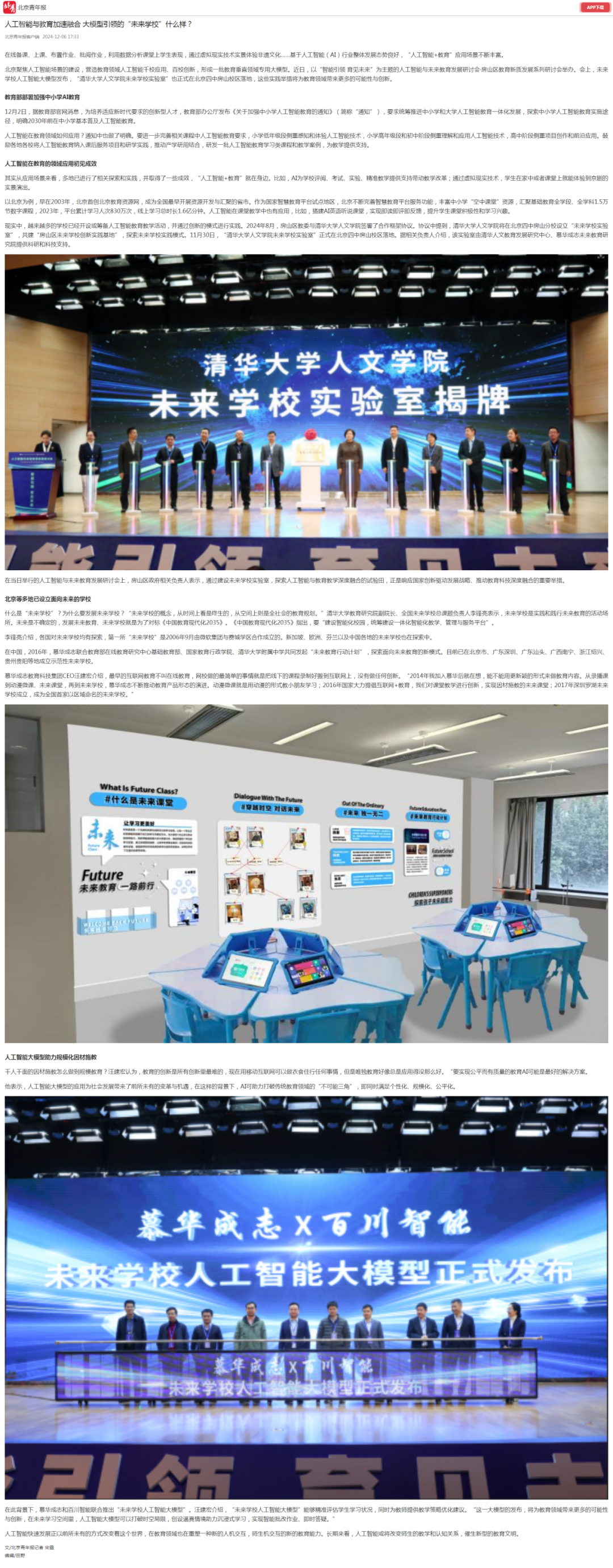 让AI人工智能植入未来学校的百天课堂教学,用AI人工智能研究全学科未来课堂的教育教学规律,搭建学习方式变革的大模型,以学习者为中心,夯实自主学习和小组合作学习。