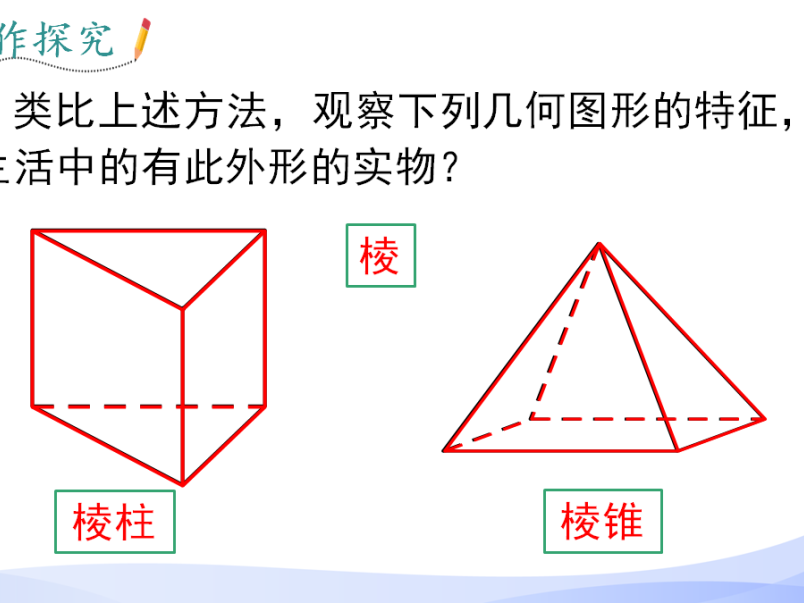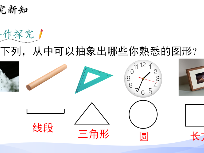 能够引导从简单实物的外形中抽象出几何图形,并了解立体图形与平面图形的区别;
