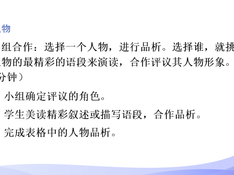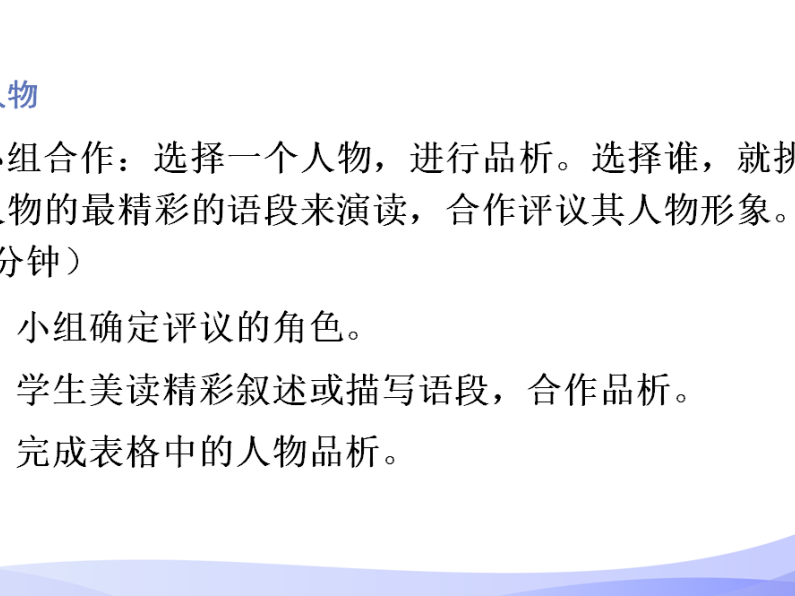 “共学”环节,提出主问题:具体说明为什么会对于人物有这样的深刻印象评价?然后组内合作研究,之后上台汇报交流,小组分工明确,有写板书填表的,有抓关键句解释的,有赋评价词理解的,还有总结发言结果的。