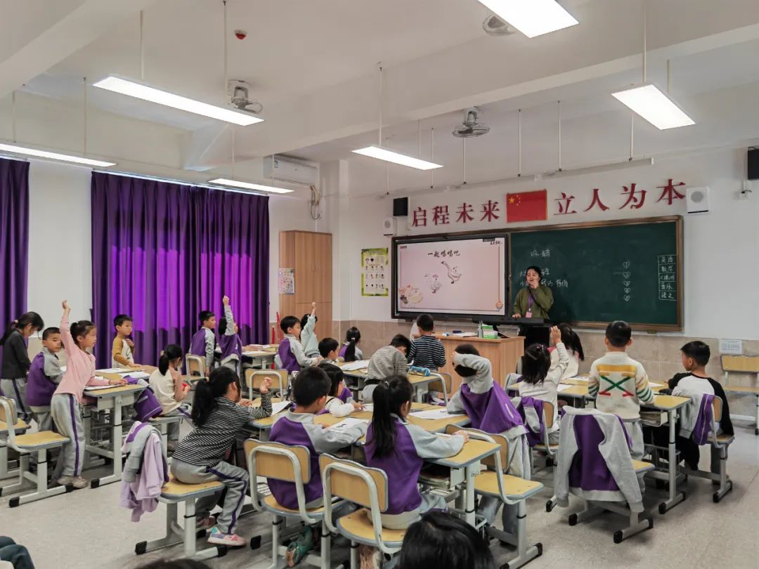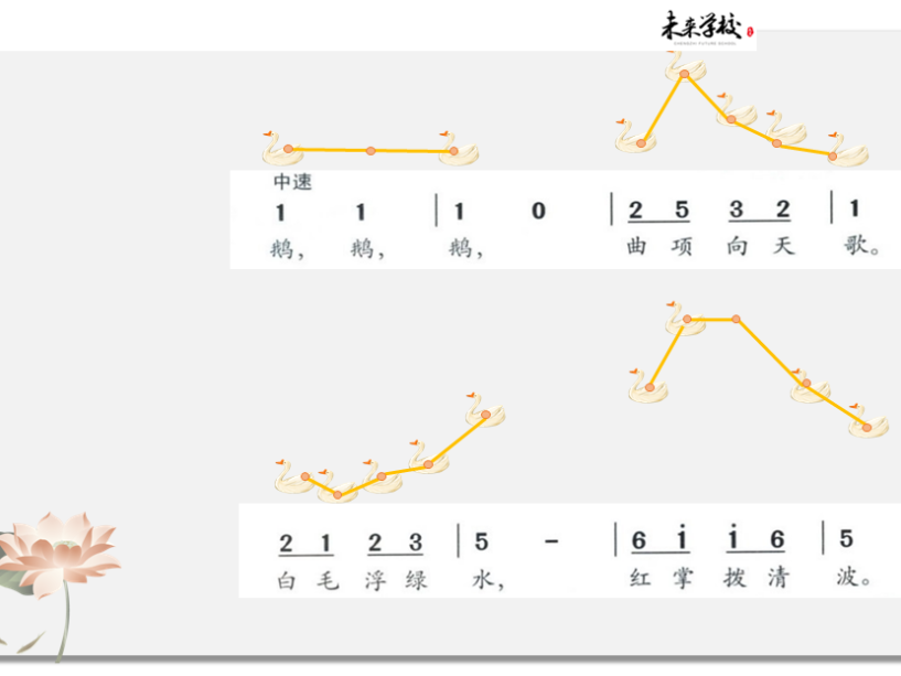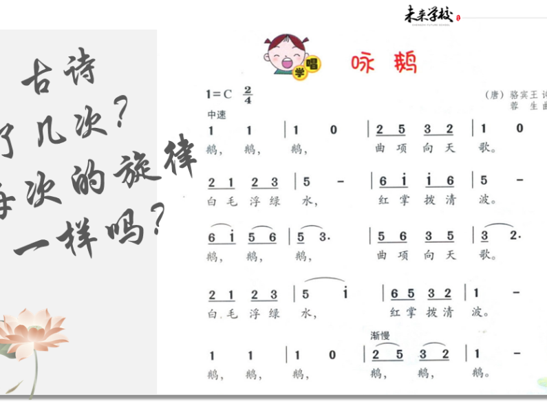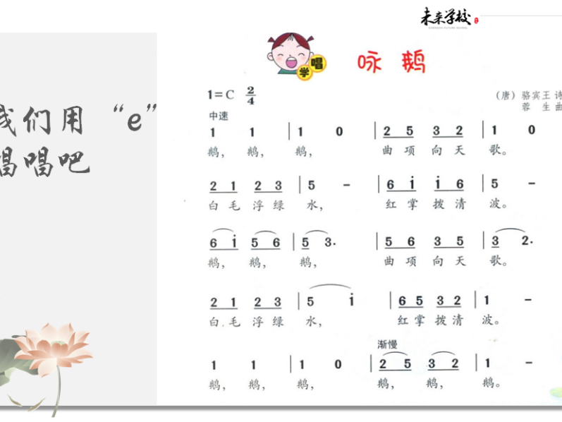 统编教材一年级音乐第七单元《咏鹅》第一课时,庄雅茹老师请了三位同学上台朗诵并复习《咏鹅》古诗,让学生熟悉古诗词,有助于演唱歌曲。