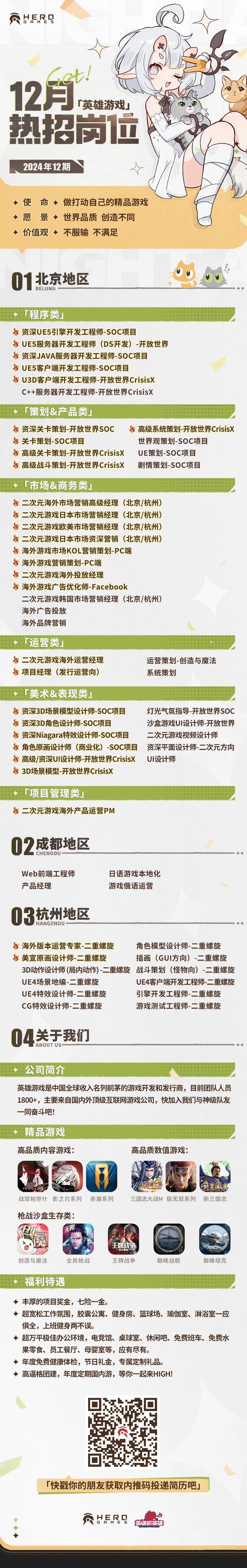 2024年,英雄游戏自研产品《星际52区》《创造吧!我们的星球》成功上线,《二重螺旋》《Crisis X》等新游开启测试并分别登陆东京电玩展、科隆游戏展,英雄游戏投资及联合出品的《黑神话:悟空》全球上线,获得了众多玩家的喜爱及支持。