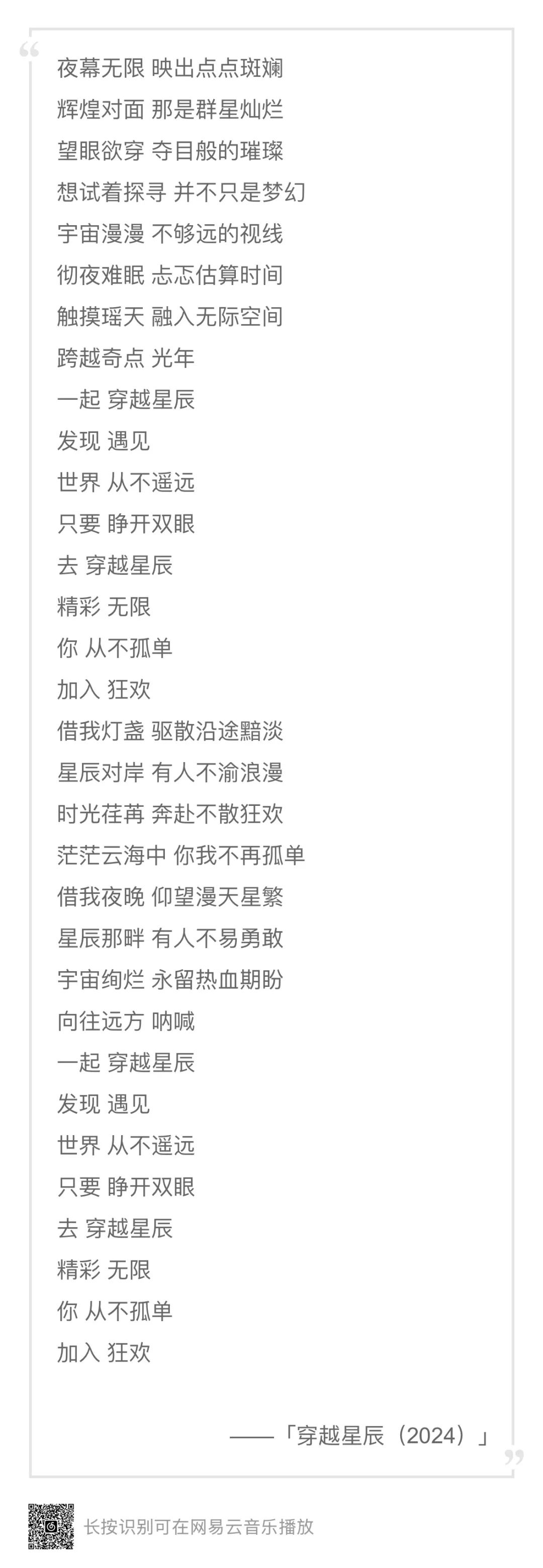带着惊喜和意外,四年后又一次听到了穿越星辰。时光荏苒,2020年的一切仿佛并没有走远。彼时我还是稚嫩的初二学生,刚刚踏入十一不久。可如今竟然已经来到了高三,在十一的最后一年。再次听到穿越星辰,录制时那些有趣美好的瞬间又浮现在我的眼前。如今感叹自己何尝幸运,能通过歌手大赛和穿越星辰结识到才华横溢的学长学姐们,渡过一段难忘的回忆。四年后,记忆中那段美好的时光依然给予我无限的动力。向着未来和浩瀚宇宙,发现、遇见无限的可能。
