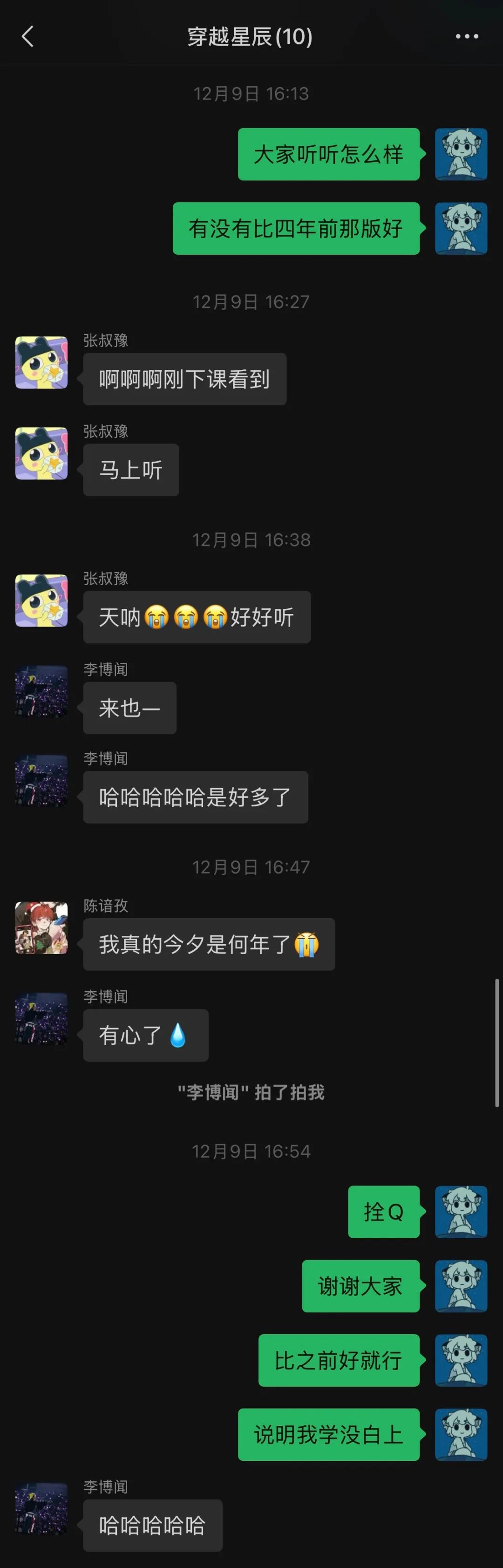 我是2023届的毕业生,录制《穿越星辰》已经是四年前的事了,某天早上打开手机看到了重新混音的消息弹出来,简直有一种恍如隔世的感觉。其实当时能作为歌手大赛的决赛选手参与录制我就感到十分幸运,这也是我之后绝无再有的体验。非常感谢王涵学长在百忙之中仍想起了这首记载了我们那段珍贵经历的歌曲,听到自己四年前十分稚嫩的声音从耳机里传出来的感觉实在是非常奇妙,也非常感动,感觉好像又回到了高中时期,那个能够有舞台有伙伴做自己热爱的事情的时候。