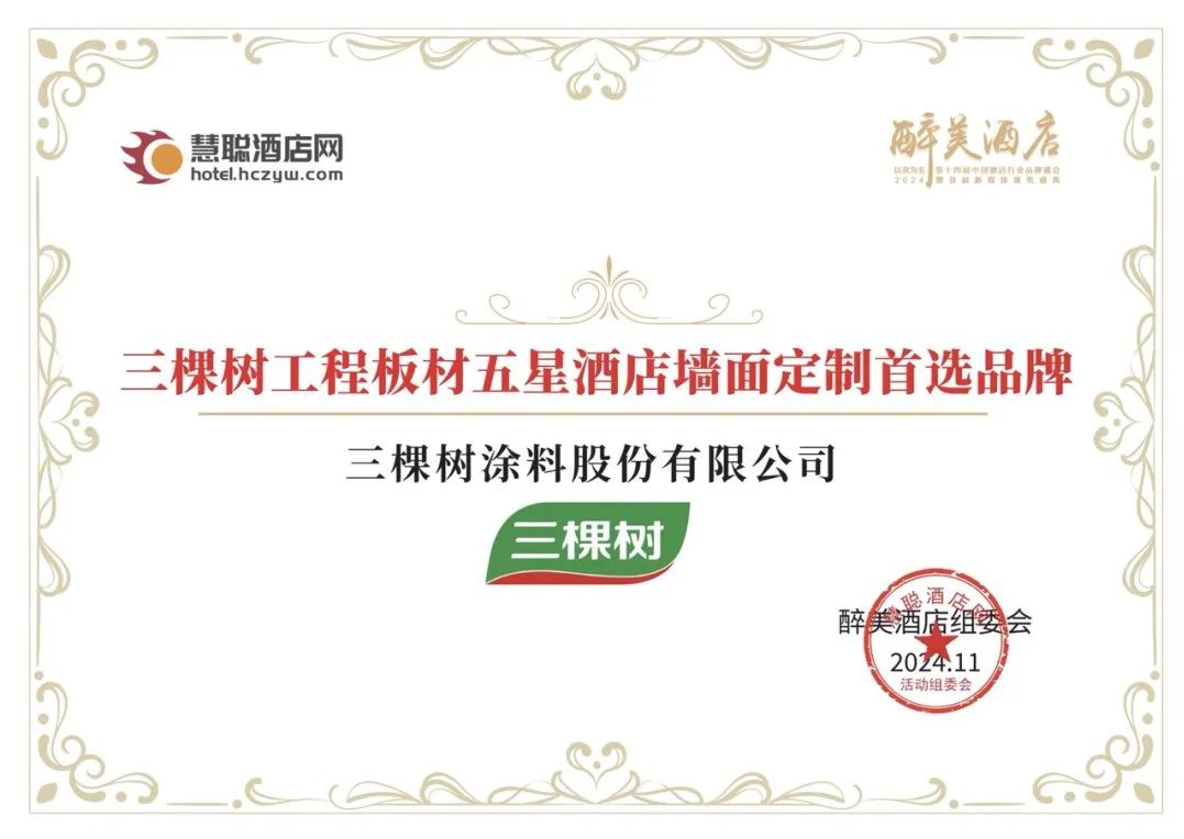 近日, “醉美酒店•以我为名”2024中国酒店行业品牌盛会圆满落幕。本次盛会汇聚了酒店行业的各方精英,围绕酒店产业链上下游协同发展,探讨行业未来趋势。三棵树凭借优异的产品品质和市场口碑,荣膺“五星酒店墙面定制首选品牌”奖项,进一步巩固了其在建筑材料领域的优势地位。