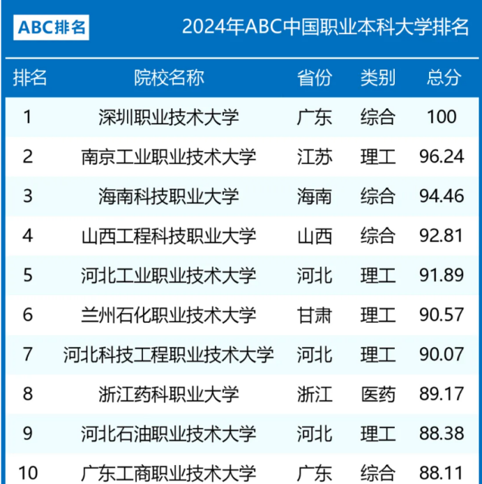 深职大也是职业本科大学中的翘楚,在2024年ABC中国职业本科大学排名中,深圳职业技术大学排名第一。