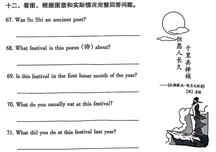 本次期末考卷中,中国传统节日成为阅读题中的高频主题。其中6年级的越秀及黄埔期末卷子更是直接考察孩子的“语文功底”,需对古诗词及成语故事有一定了解才能顺利答题。这考察学生在熟悉传统文化的同时用英文进行输出表达,是新课改之下对孩子语言应用能力要求的提高。