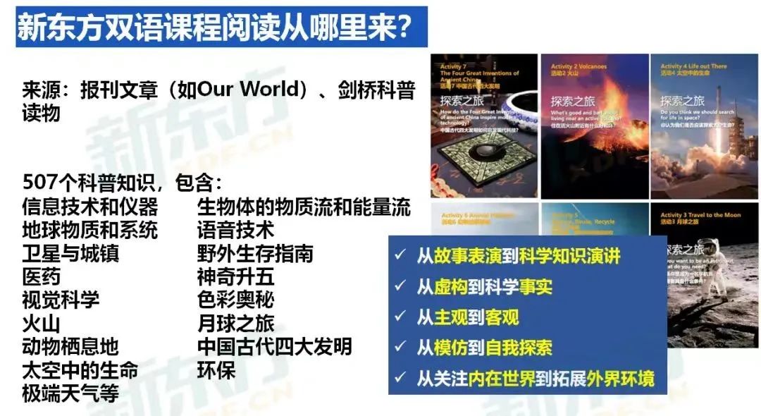 而新东方双语课程的阅读话题,选材也均来自于报刊文章、科普读物,和英语学习趋势不谋而合。
