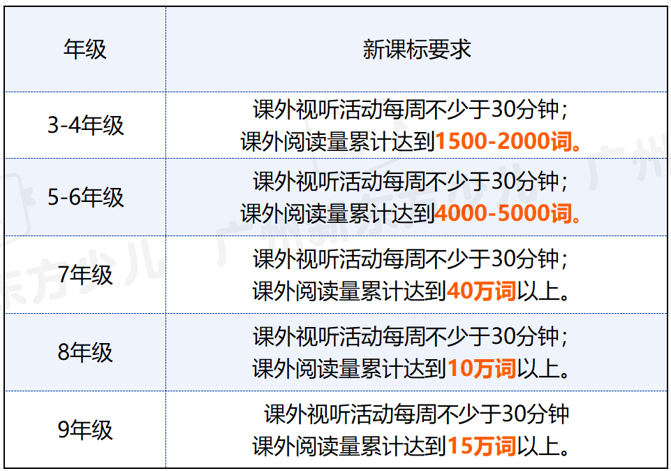 新课标中明确要求了,3-4年级的课外阅读量要达到1500-2000词,5-6年级达到4000-5000词,初中毕业要达到150000词。