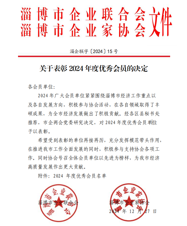 临近岁末年尾,我公司被淄博市企业联合会、淄博市企业家协会授予2024年度优秀会员称号。