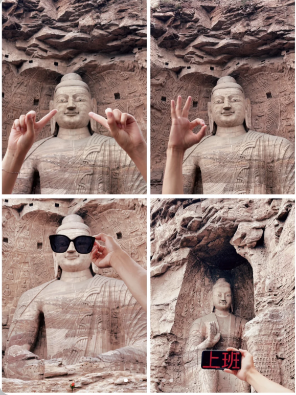 而高达17米的雄伟大佛,慈目低垂的释迦牟尼,手持乐器的伎乐天,还有那托腮沉思、飞天翱翔、跷二郎腿等生动别致的佛像,无不成为了游客创意打卡的网红点。