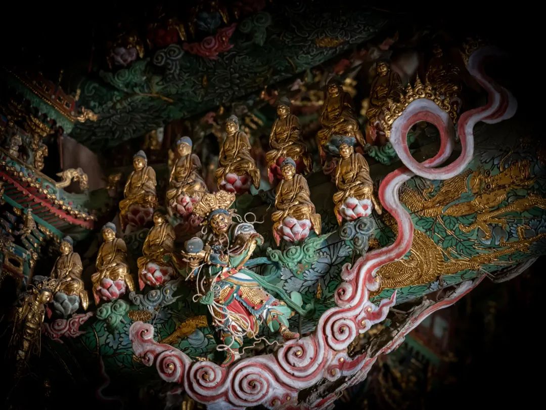 一百多平米的大雄宝殿内,天宫楼阁巍峨壮观,仿佛步入了神话世界。菩萨、神鸟、孔雀、鹦鹉等千尊彩塑在云端伫立,栩栩如生,虽然多却一点也不杂乱。