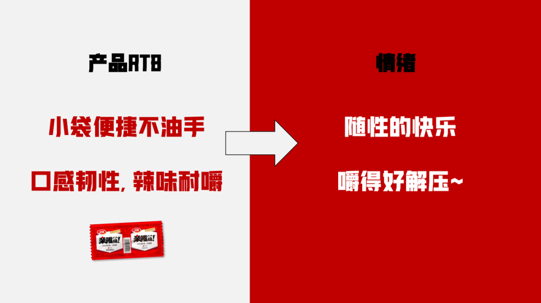 目标的设定,来自于背后对人群和场景的深度洞察。辣条产品差异化较小,市面上众多品牌都有类似产品,竞争激烈。对于消费者来说,购买同类产品决策成本低,这种品类乍看似乎更依赖于渠道优势,但同时,辣条作为零食类产品,情绪消费,Z世代年轻人自主意识更强,愿意为自己的情绪买单,如果能占领消费者心智,建立情感连接,就能给品牌带来更大的主动权。