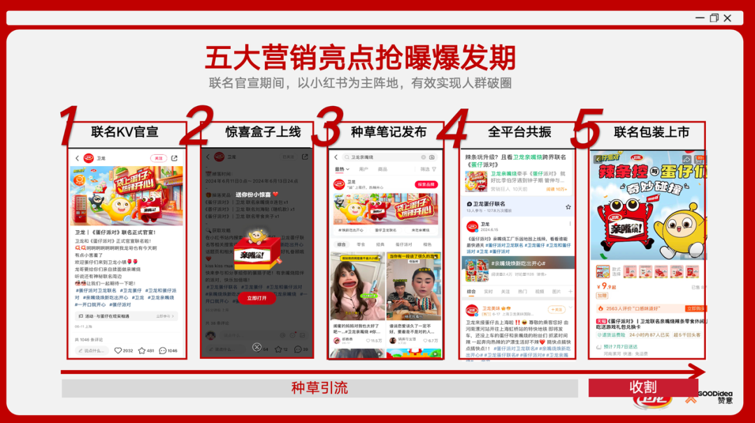 接下来,利用KOL组合发布种草笔记,打造内容矩阵,提升平台内声量,进一步在全平台内容呼应形成共振。最后,电商上架《蛋仔派对》联名包装产品实现收割。