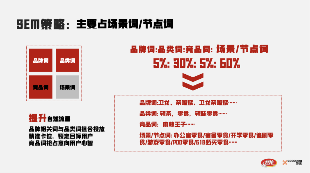SEM策略上,集中火力占据场景与节点词,将“食用零食解压”的场景与亲嘴烧产品进行强绑定,加强“口袋辣条”和“一开口,就开心”的用户心智。