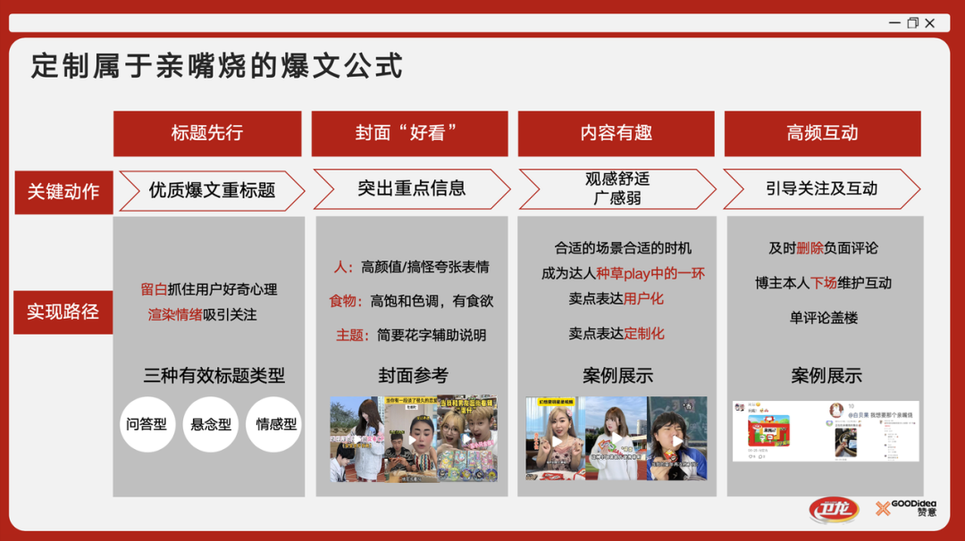 那么,赞意是如何帮助卫龙通过创意内容和玩法,精准传达亲嘴烧作为“口袋辣条”和“吃得开心”的信息,进而影响用户心智?