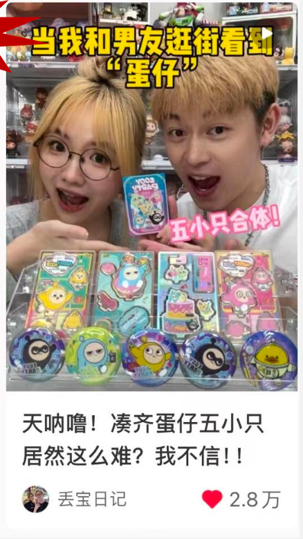 以盲盒博主 @丢宝日记 的笔记为例,封面强调集齐《蛋仔派对》相关周边,对《蛋仔派对》深度玩家吸引力极高,造就高点击率。内容则是年轻人中非常受欢迎的抽卡,具有未知性,吸引用户不断观看,品牌的出现配合剧情、循序渐进。同时博主设置品牌强相关的互动,并积极引导评论区。