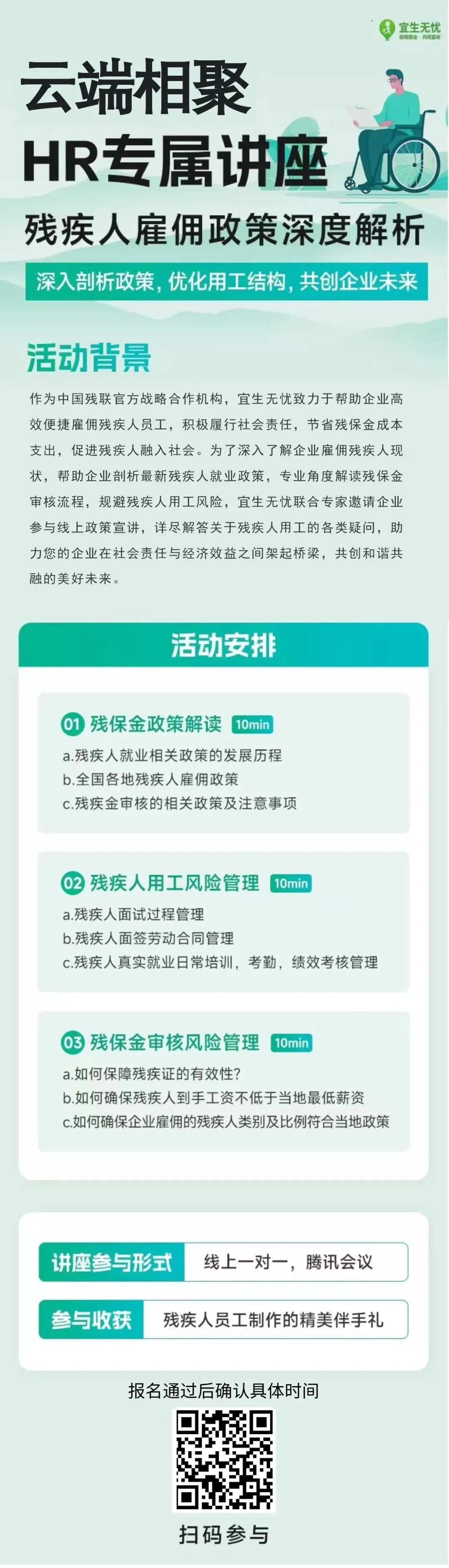 宜生无忧作为行业内领先的互联网+残疾人就业平台。自2016年起便致力于通过多种方式融入参与残疾人就业事业发展,以创新的“公益+商业”的服务模式,旨在加速及促进残疾人就业安置,提高残疾人收入及生活水平,帮助企业更加高效便捷雇佣残疾人员工及履行企业社会责任,从而提高企业社会公益形象,降低企业运营成本。
