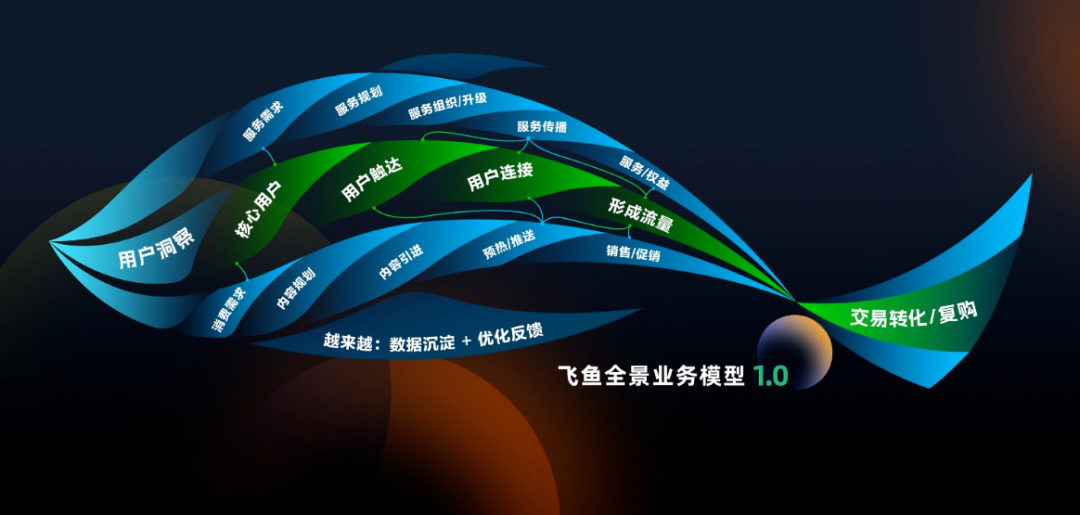 随着市场整体进入存量时代,对于新开购物中心,要想在激烈竞争中脱颖而出,打造差异化优势,取得良好预期,离不开前瞻性的数智化研策支持;对于存量商业来说,日常项目运营,更需要紧跟主力客群的需求变化和竞品动态,及时调整市场策略和运营方向,快速响应消费市场变迁,实现高质量发展。为了响应客户个性的、深度的洞察需求,除了通过全景智图为客户提供标准化的数据监测分析支持外,MobTech还在项目常态化经营过程中,融合在营项目方的数据资产进行联合开发,量身打造定制化的数字化平台,满足企业在日常运营全流程中的多样化监测需求。随着新一代消费者以“自我为中心”的消费理念开始觉醒,购物中心的会员运营思维,也从过去的以“货”为中心,转变为以“消费者”为中心。这也与新城控股集团旗下吾悦广场深度运营中所推崇的为用户创造价值的概念不谋而合。站在未来视角,新城商业围绕深度运营剖析制定了一条独具特色的经营链路,并拟真为飞鱼的形象。飞鱼模型形成的三条链路中,聚焦用户链路,可以从用户洞察、核心用户、用户触达、用户连接、形成流量五大板块,剖析出新城商业践行深度运营的这一年,是如何以用户思维,探索可持续发展的商业生态的。