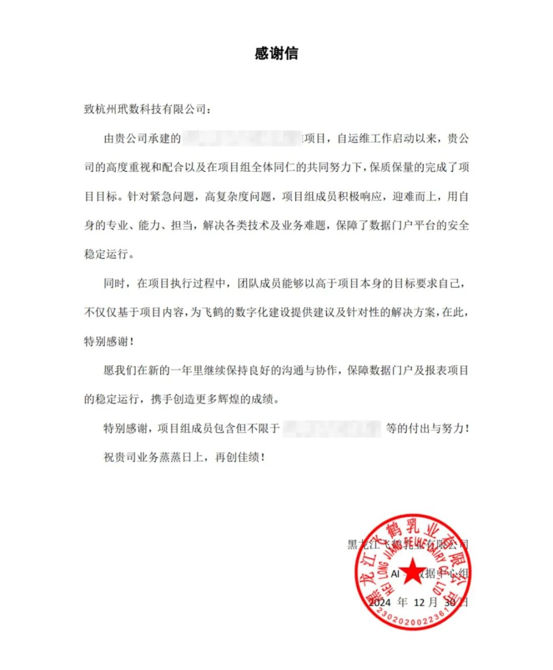 感谢贵司在项目中的高度重视和配合,项目组成员积极响应,解决各类技术难题,保障了平台的安全稳定运行。团队成员还提供了超出项目要求的建议和解决方案,助力飞鹤的数字化建设。期待未来继续保持良好合作,共同创造更多辉煌成绩。