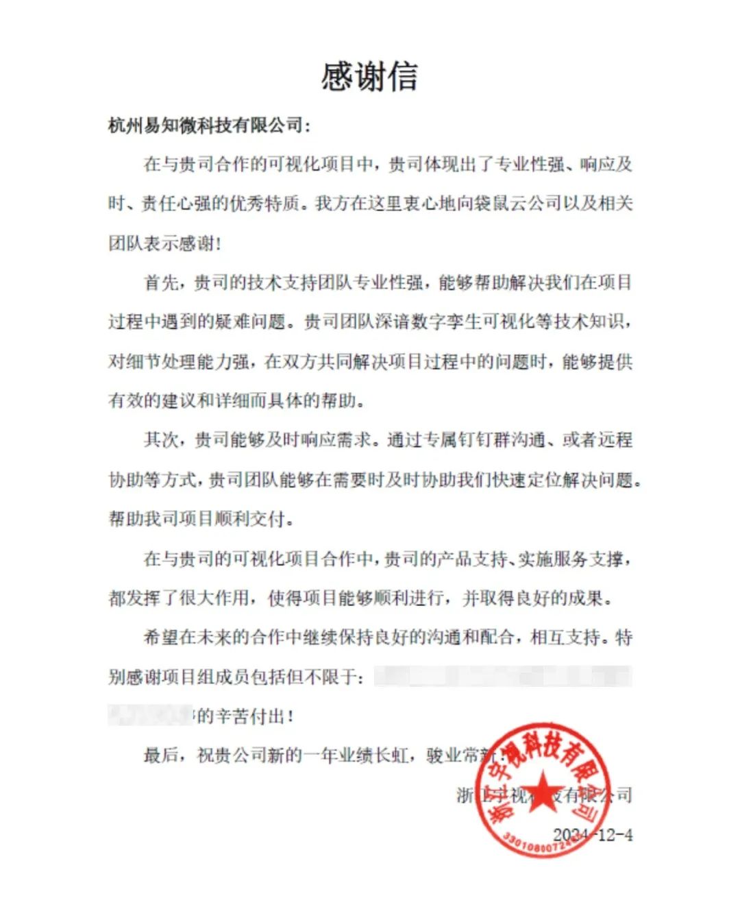 感谢贵司在可视化项目合作中的专业支持与及时响应。贵司团队展现了强大的技术能力和责任心,帮助项目顺利交付并取得良好成果。特别感谢项目组成员的辛勤付出,期待未来继续合作。祝贵公司业绩长虹,骏业长新!