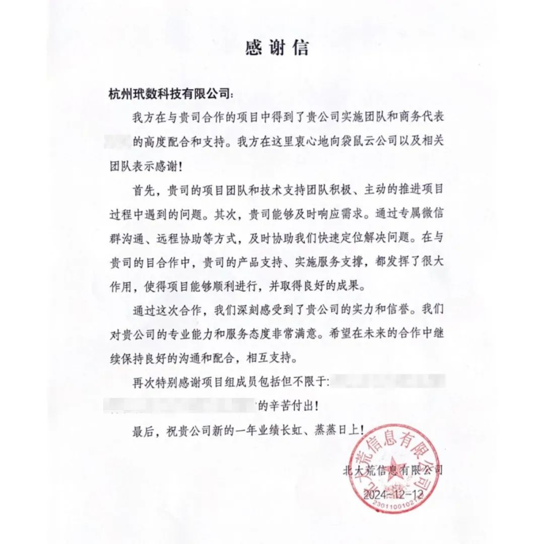 感谢贵司项目团队和技术支持团队在合作中的积极态度和高效响应,通过专属微信、远程协助等方式及时协助、快速定位解决问题,项目得以顺利进行并取得良好成果。期待未来继续合作,并祝愿贵司新年业绩蒸蒸日上。