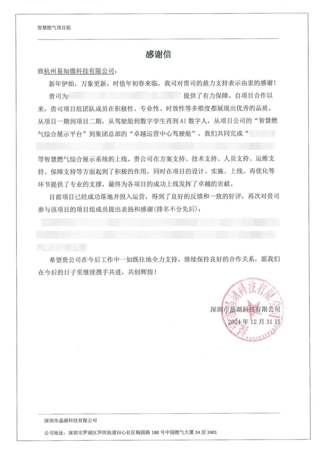 在今年的项目建设中,贵公司在技术协助、人员支持、运维保障等方面提供了有力的支持与贡献,在大屏设计优化与升级中提供了专业的技术支撑,在响应速度上面发挥了积极的作用。不仅为生产指挥中心注入了新的活力,也为我们未来的合作奠定了坚实的基础。在此向贵公司及所有参与项目的成员致以最诚挚的感谢。愿在今后的日子里继续携手共进,共创辉煌!
