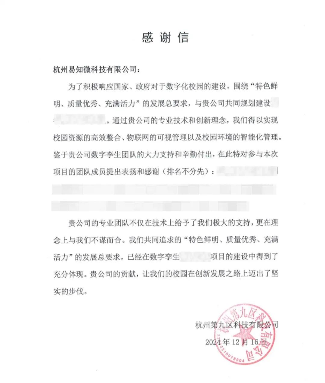 在与贵公司共同规划建设校园项目中,通过贵公司的专业技术和创新理念,我们得以实现校园资源的高效整合、物联网的可视管理以及校园环境的智能化管理。感谢贵公司数字孪生团队的大力支持和辛勤付出,让我们的校园在创新发展之路上迈出了坚实的步伐。