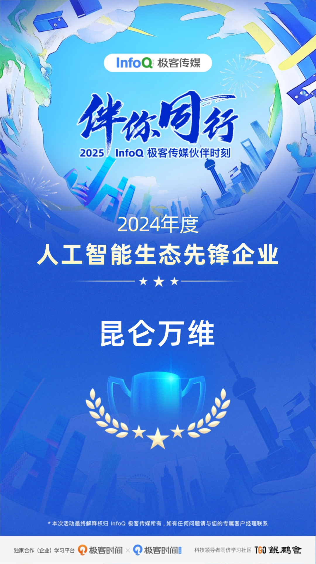 InfoQ 2024年度评选近期落下帷幕。该奖项评选专门针对AI时代展开,意在选出哪些勇于拥抱AI、发展AI、创造AI的明星企业,正是它们在AI领域的早期介入和持续创新不断推进着这个时代的前进。本次评选中,昆仑万维荣获“2024年度人工智能生态先锋企业”称号。