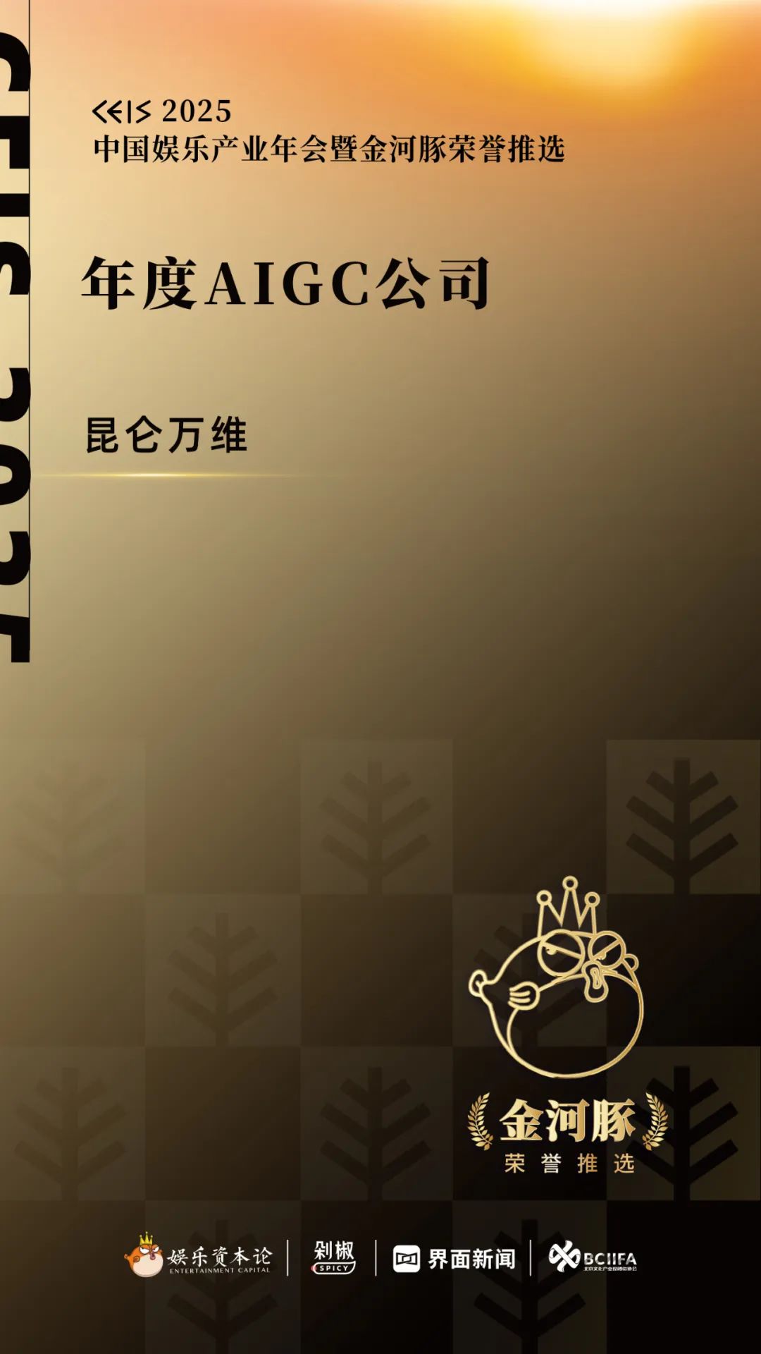 近日,CEIS 2025中国娱乐产业年会暨金河豚荣誉颁奖盛典顺利举行,来自电影、长剧、短剧、综艺、营销、IP 联名六大领域的行业领袖带来最新的行业趋势分享。其中,金河豚荣誉推选于2017年发起,每年定期举办,以媒体的客观中立和宏观视角筛选备受业界瞩目、具有行业前瞻性并引领未来发展方向的人员和项目,以树立行业标杆、提升产业规范、弘扬文娱产业正能量。凭借过去一年在AIGC方向上的产品创新和对内容创作领域的颠覆性贡献,昆仑万维荣获“2024年度AIGC公司”。