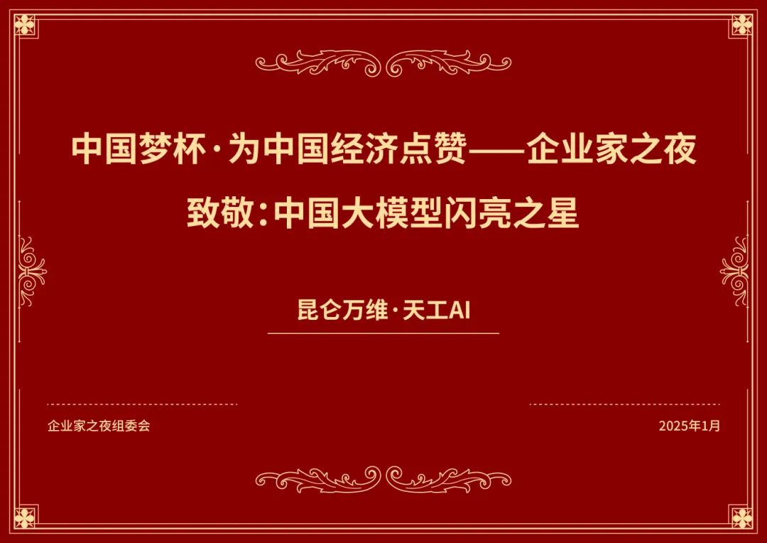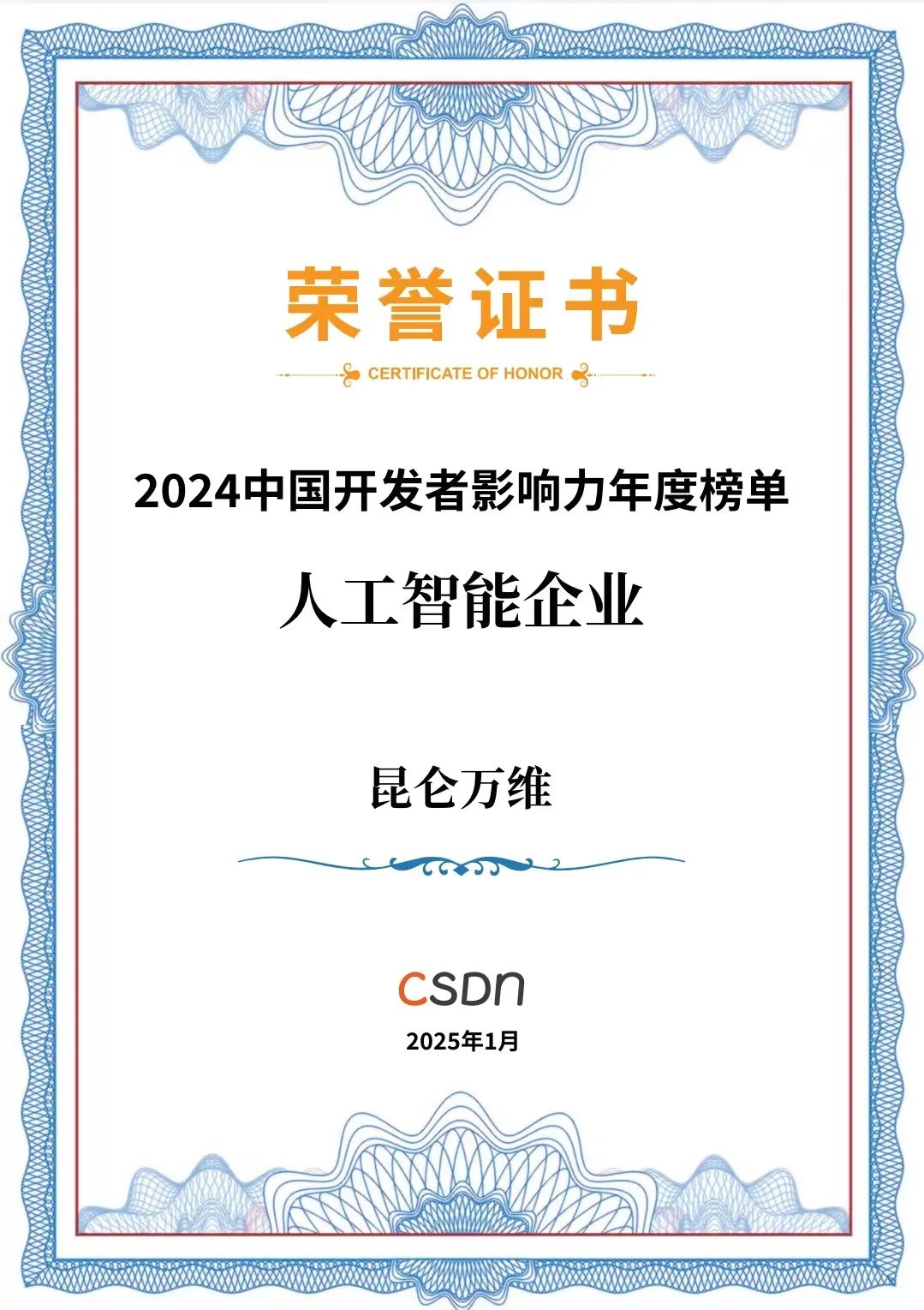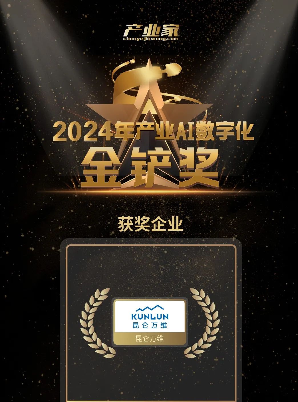 近期,中国网、人民日报海外网、财联社、财经网、新浪财经、CSDN、InfoQ、娱乐资本论、产业家等机构和媒体相继发布2024年度奖项评选结果。昆仑万维凭借在人工智能、科技创新等领域的成就及影响力,获得了2024年度影响力企业、2024中国出海品牌新锐20强、2024最具投资价值奖、2024年度行业影响力品牌、中国大模型闪亮之星、2024年度人工智能企业、2024年度人工智能生态先锋企业、2024年度AIGC公司、2024年度产业AI数字化企业9项权威奖项,体现了市场、媒体和公众对昆仑万维在投资价值、社会价值、品牌影响力等多方面的认可。