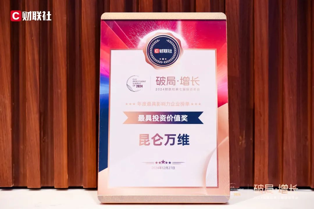 财联社于2024年12月27日成功举办了其第七届投资年会。此次年会汇聚了众多知名大咖,他们的精彩观点在现场激情碰撞,共同奏响了“破局”与“增长”的主旋律。昆仑万维在本届投资年会上荣获年度最具影响力企业榜单“最具投资价值奖”。