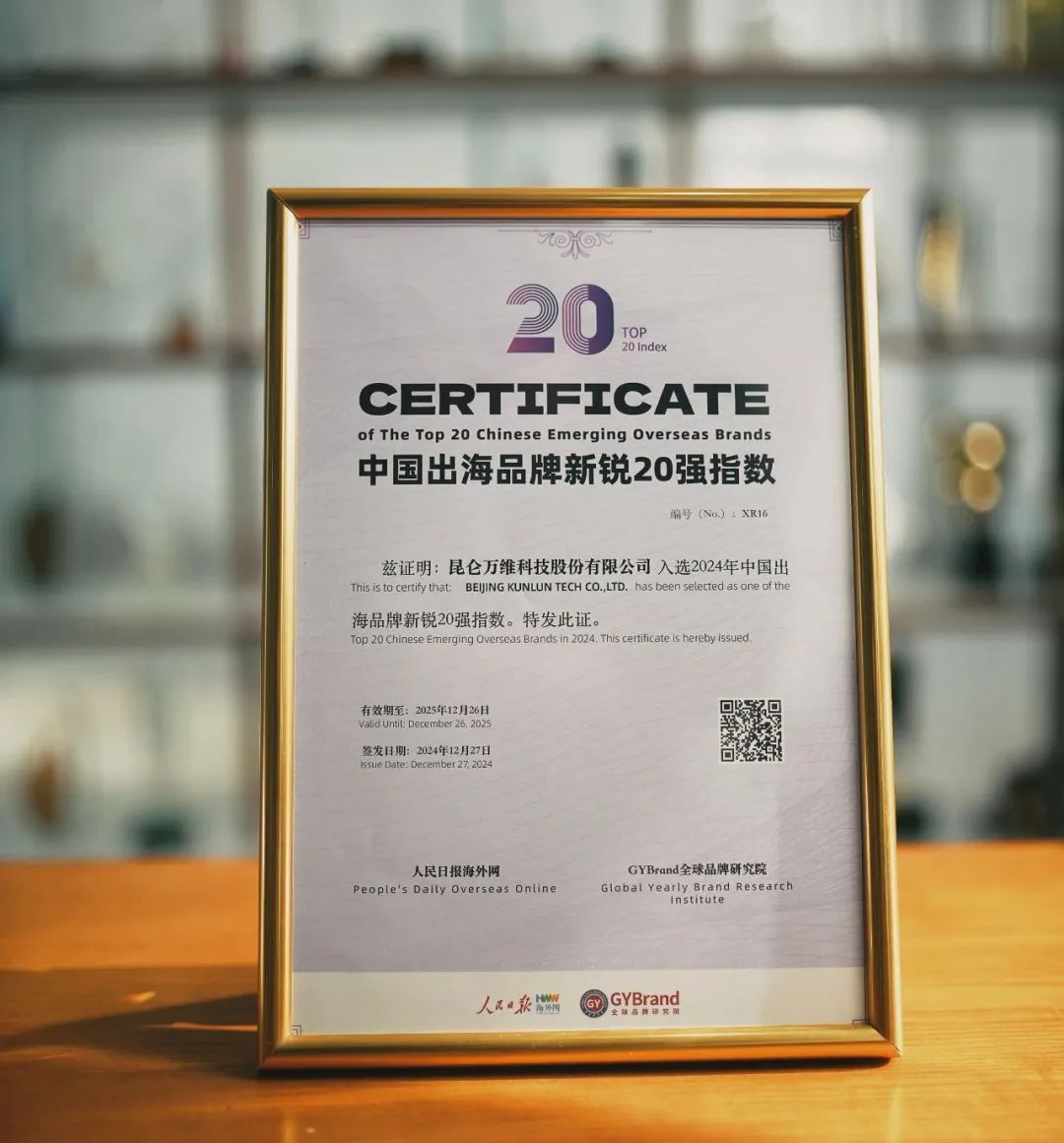 活动现场,人民日报海外网发布2024中国出海品牌100强指数、中国出海品牌新锐20强指数、中国品牌海外传播优秀案例、《企业ESG蓝皮书:中国企业环境、社会与治理报告(2024)》、《2024中国企业ESG100指数》、《2024中国企业ESG蓝皮书案例》以及《无废城市 中国故事》短视频征集活动优秀案例等多项成果。昆仑万维以卓越的出海影响力,入选“中国出海品牌新锐20强指数”。